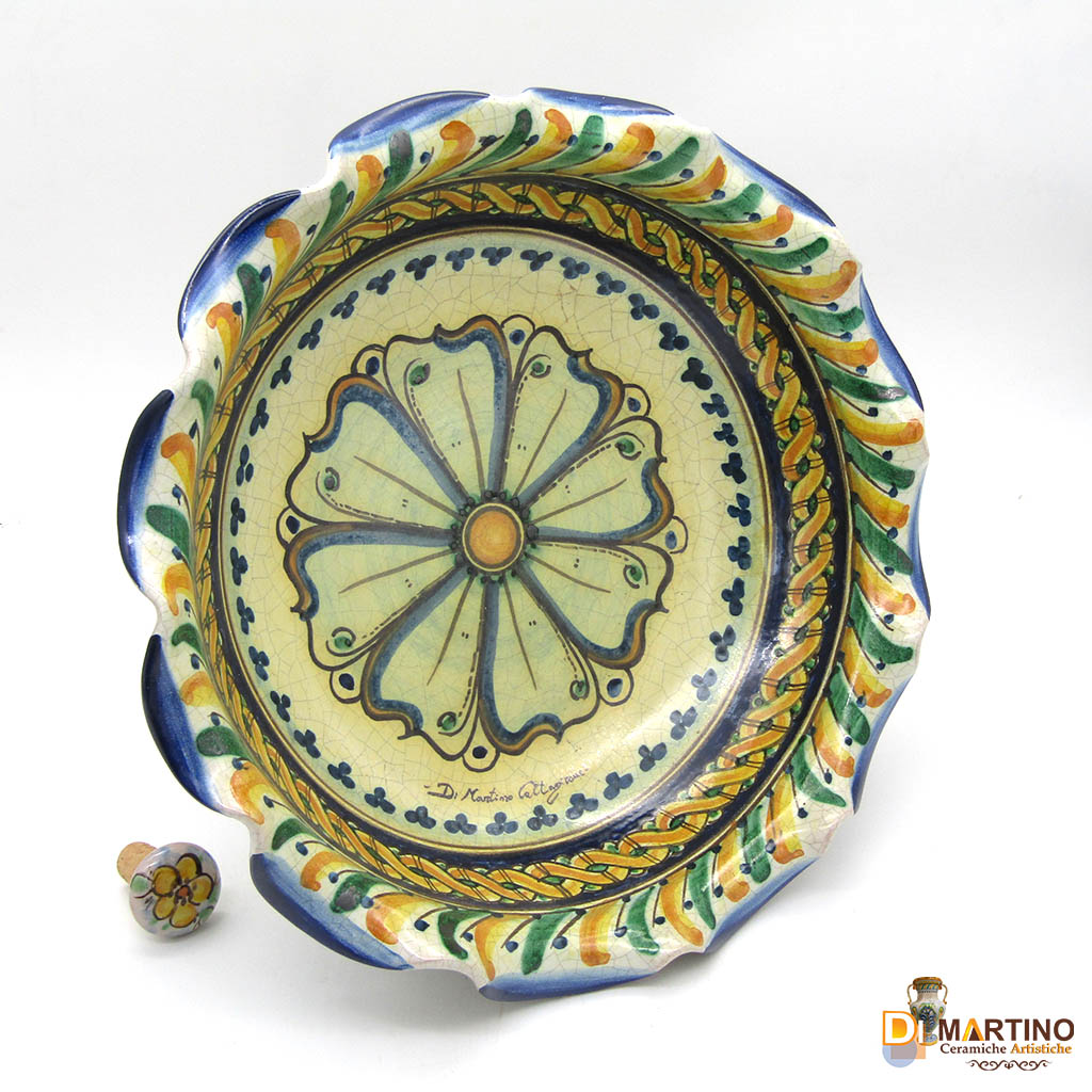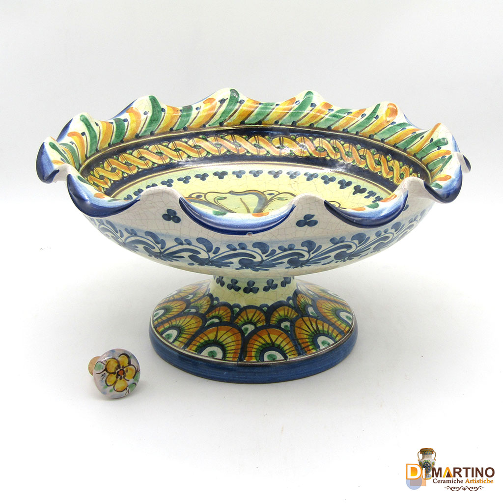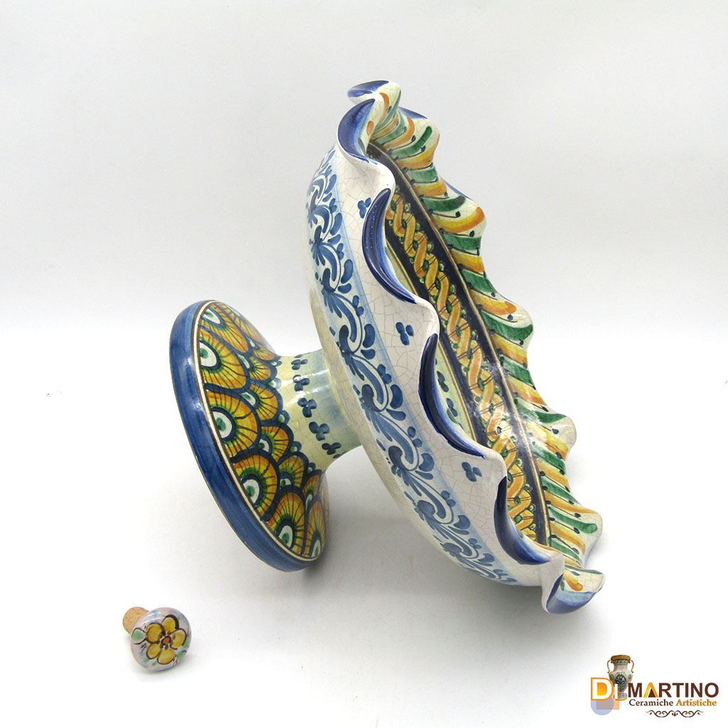 Fruttiera foggiata a tornio, smerlata con piede, decoro catena blu cobalto e rosone centrale, con piede coda di pavone. Alzata molto ricca come decoro, fine ed elegante, il suo smalto satinato con una patina iridescente effetto oro la rendono ideale sopra un mobile in legno.