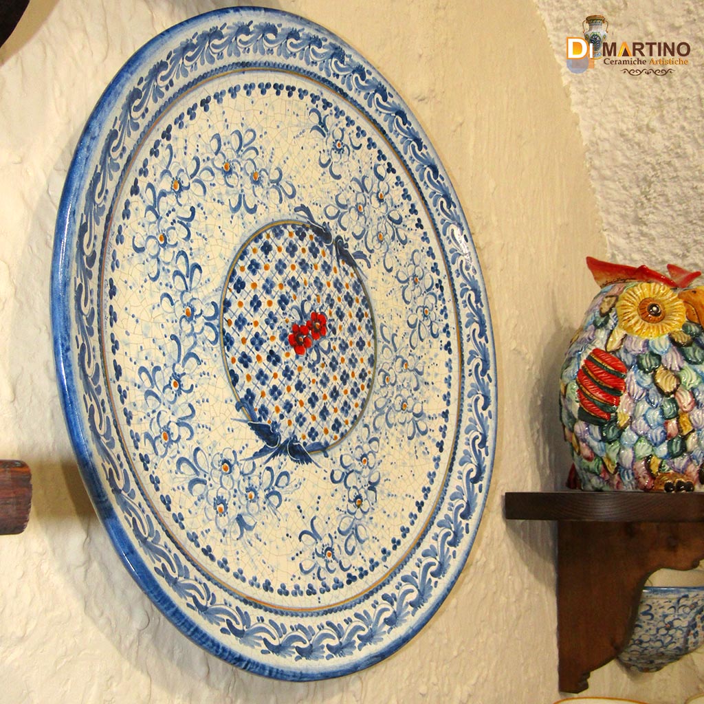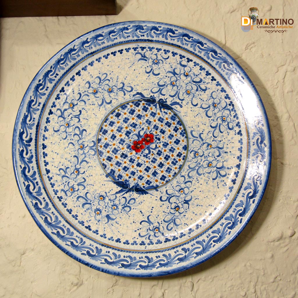 Piatto murale diametro 55cm, decoro retino azzurro con fiorellini rossi.