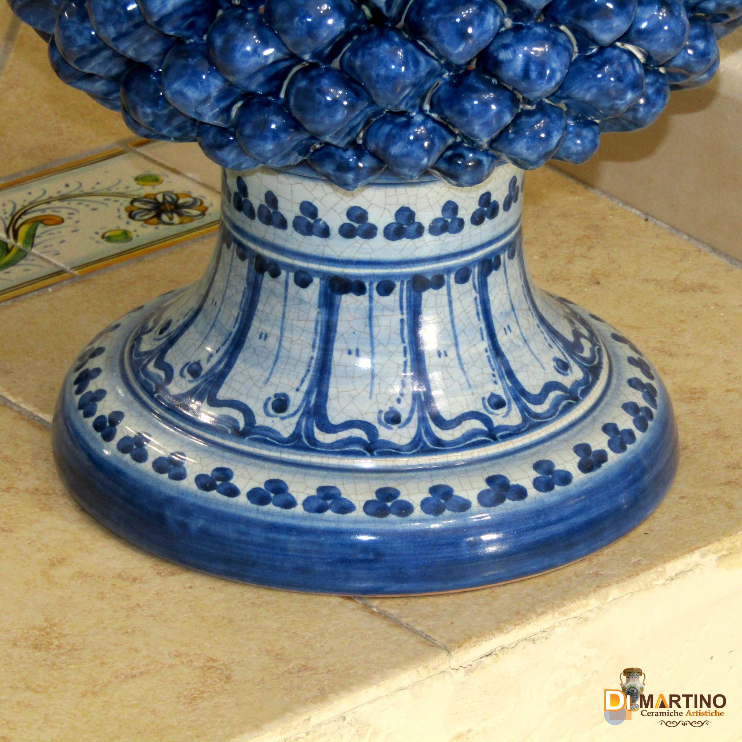 Pigna tradizionale, totalmente foggiata a mano, con il classico Blu Antico che le dona eleganza e raffinatezza. Piede decorato con decoro '700, smalto turchese ed antichizzato. Il blu in particolare viene passato a pennello, e non ad immersione (tecnica industriale), pertanto non risulta omogeneo, ma in alcuni punti sarà più vivace in altri più tenue, creando un giuoco di luci ed ombre particolare.