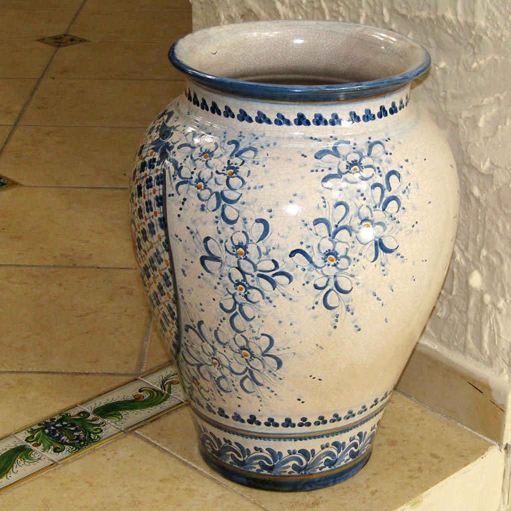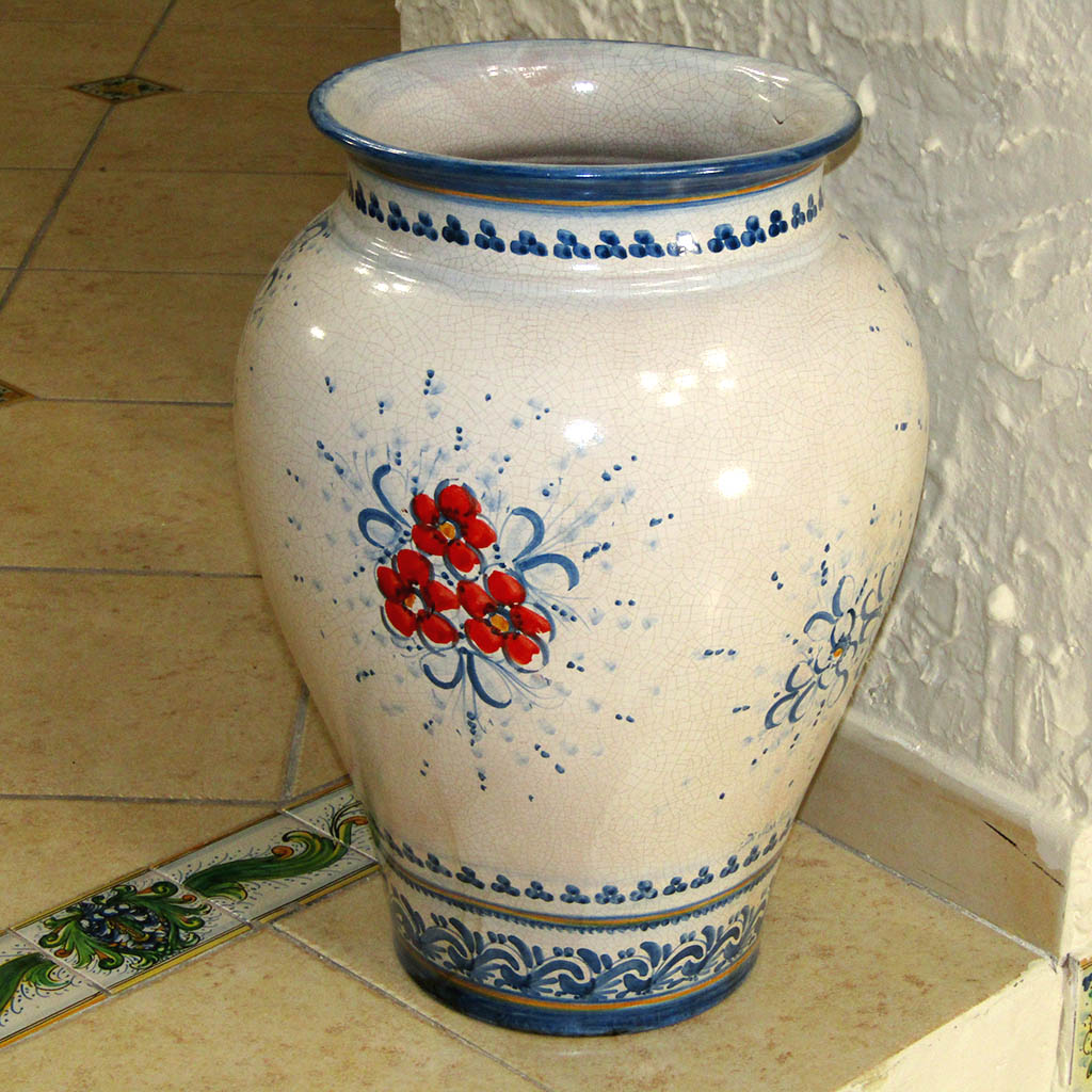 Portaombrelli forma classica tipica ovale bombato, decoro retino blu con fiori rossi (decoro risalente al XVII secolo da noi rielaborato). Sta benissimo sia in ambienti classici che moderni.