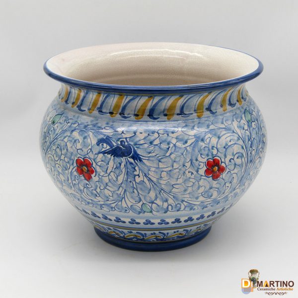Portapiante decoro ghirigori azzurro su smalto antichizzato, perfetto in ambienti moderni. Dimensioni : diametro 33cm - altezza 27cm.