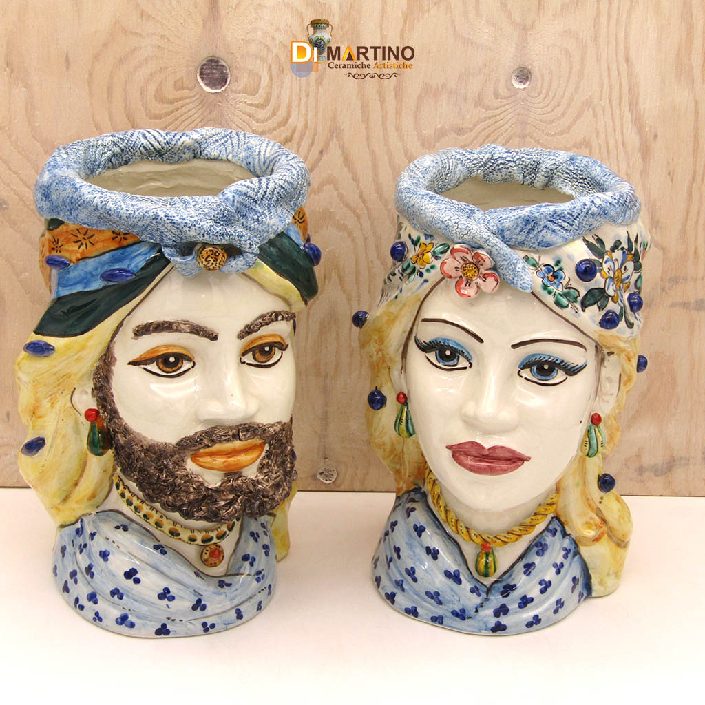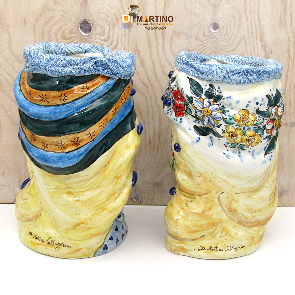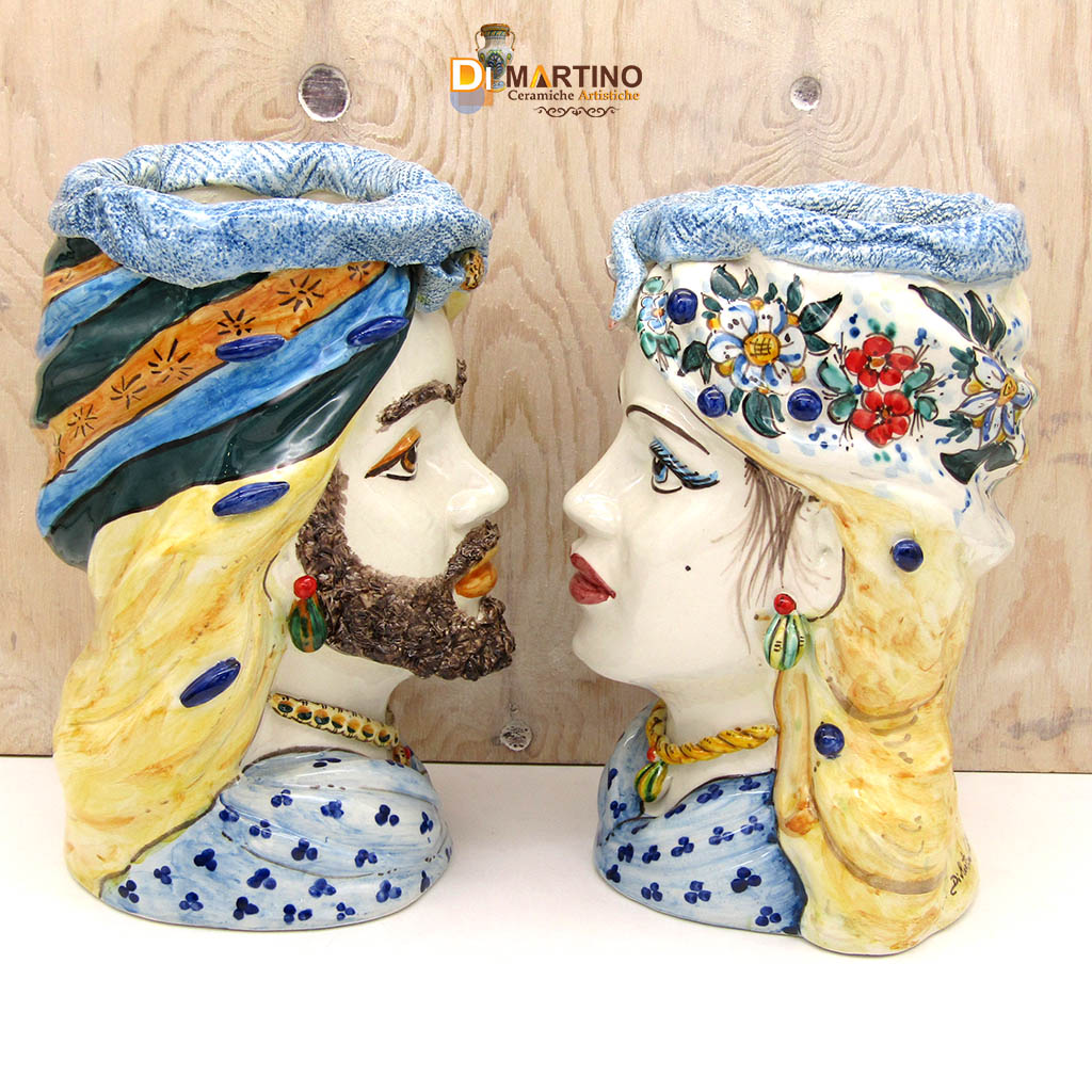 Coppia di teste di moro foggiate interamente a mano, smalto lucido effetto vetro, colori sgargianti e moderni, perfette anche in ambienti moderni. Decorazione floreale a mò di ghirlanda.
