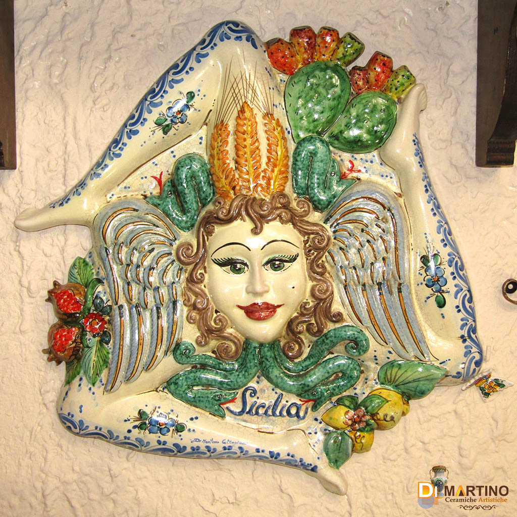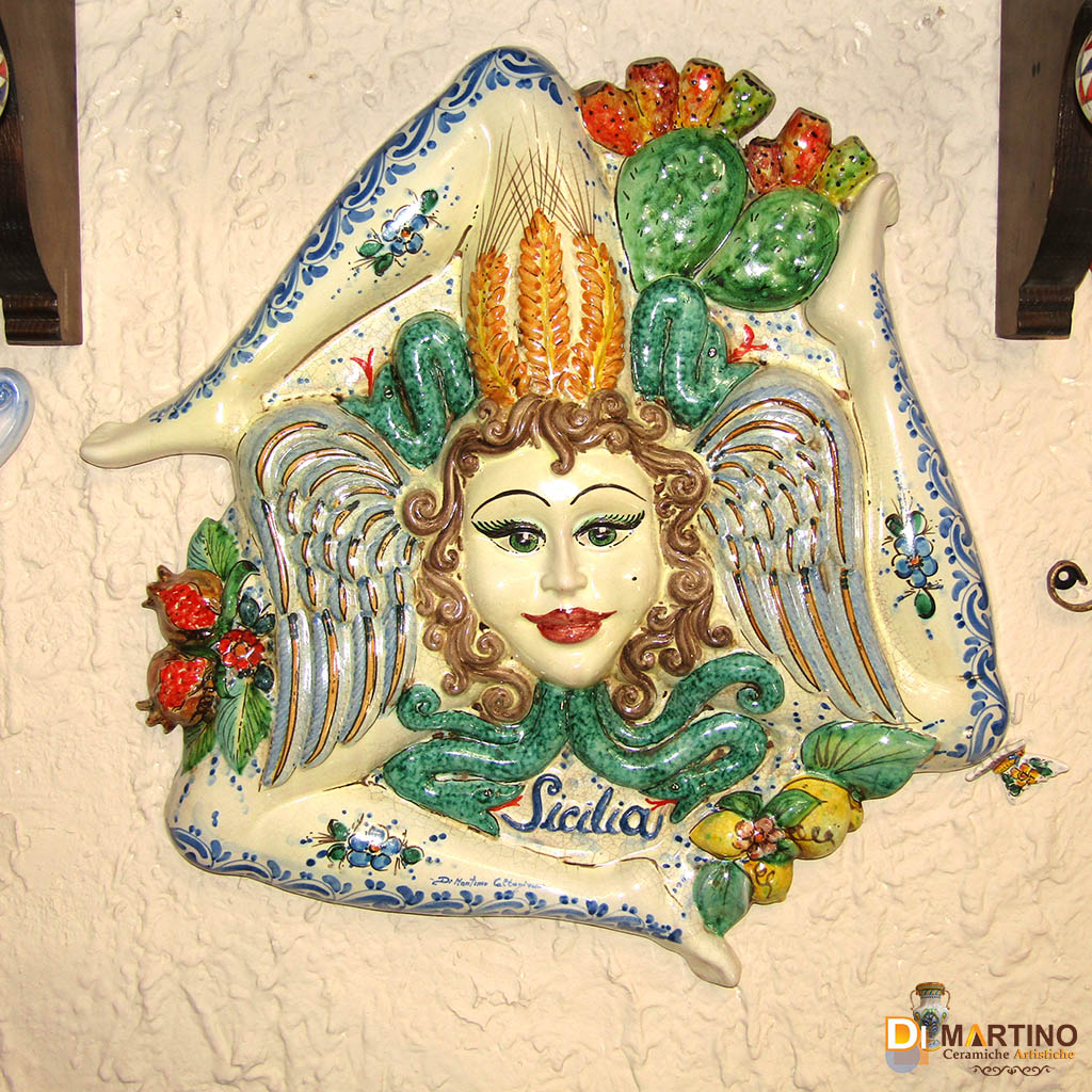 La trinacria in ceramica, è un simbolo iconico della Sicilia. Rappresenta una testa di medusa con le tre gambe piegate, emblema del movimento e della forma triangolare dell'isola. Considerata un portafortuna ed elemento decorativo che celebra identità, protezione e fertilità. Smalto satinato effetto oro iridescente, colori vivaci.